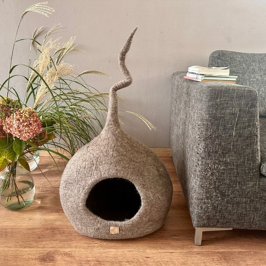 De minimalistische vorm, zachte natuurlijke kleuren en Scandinavische uitstraling maken WoolNest tot een kattenhuisje dat moeiteloos in elk interieur past — eindelijk een mand die niet stoort, maar juist toevoegt.